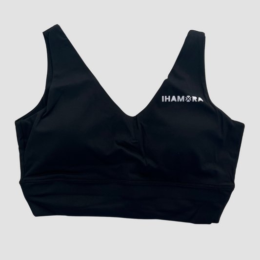 • Woman wearing Black V-neck sports bra, IHAMORA activewear.